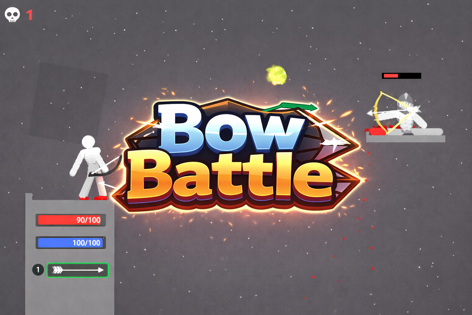 If you enjoy stickman archery games with physics combat and fast duels, Bow Battle is the best choice. During the game, you need to reduce your opponent’s health to zero using bows and precise arrow shots. Unlike basic shooting games, you need to plan carefully to destroy enemies and collect the bonuses for upgrades. If you run out of stamina, your ability to attack or move becomes limited. During the match, special apples appear that provide powerful bonuses. Red apples restore health, blue apples increase stamina, and some mixed types may provide both. These help you attack the enemy or move to collect resources. Arrows follow realistic trajectories, so players must adjust angle and power depending on distance and enemy movement. Ready to start the battle, single player or Challenge mode?